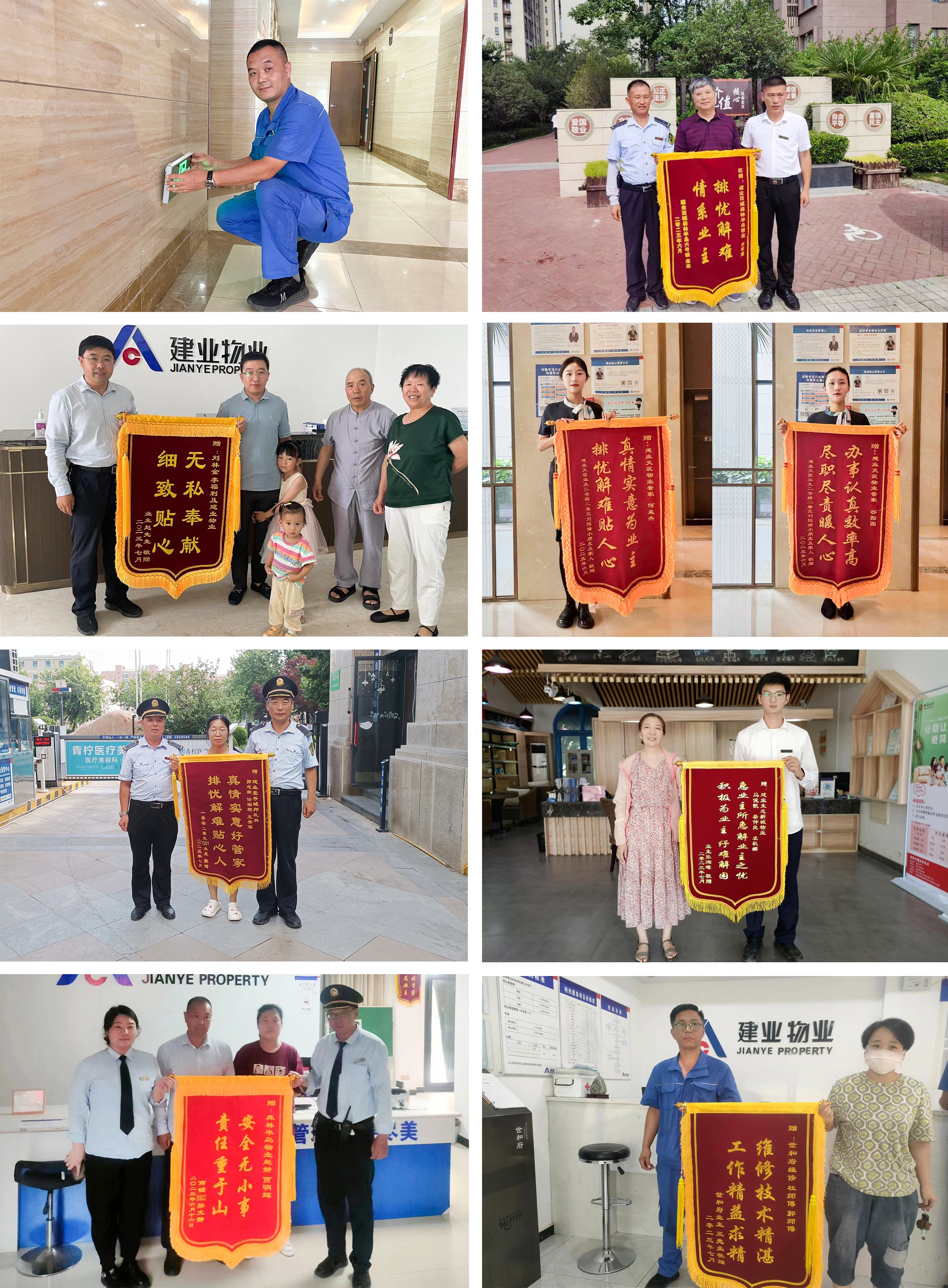 7月份,建業(yè)物業(yè)在管園區(qū)涌現(xiàn)出好人好事844件,其中收到錦旗192面、感謝信93封、其他致電表揚等559次。
